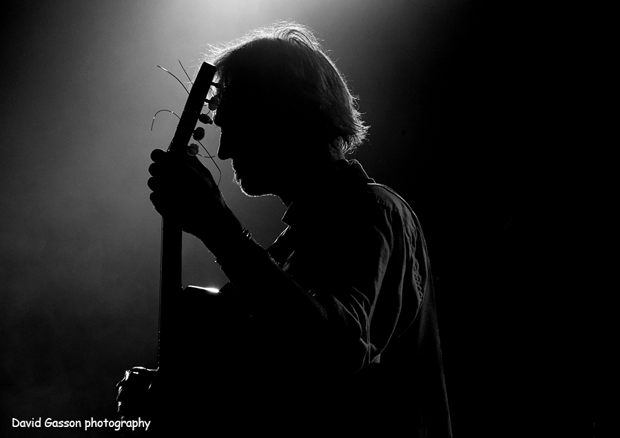 A great black and white moody shot of the musician. The majority of the performer and the guitar is in silhouette. But the silver and white light shines through onto his strumming hand, highlights his hair and also defines his facial features.